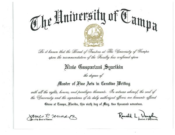MFA in Creative Writing (terminal degree) from The University of Tampa, Florida. In addition,